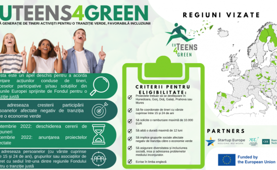 Ai intre 15 și 24 de ani și locuiești într-unul dintre județele beneficiare ale fondului pentru tranziție justă: Gorj, Dolj, Hunedoara, Mureș, Galați sau Prahova? EUTeens4Green este șansa ta de a-ți pune în aplicare ideile în ceea ce privește tranziția verde. Tinerii cu vârste cuprinse între 15 și 24 de ani […]