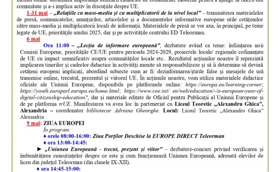 EUROPE DIRECT Teleorman, centru de informare al Comisiei Europene, organizează marți, 6 mai, ora 11:00, o nouă lecţie de informare europeană la Liceul Teoretic „Alexandru Ghica” Alexandria. Vom vorbi cu elevii și cadrele didactice din această instituție de învățământ despre dezinformare, ştirile false și mesajele de ură transmise în mediul […]
