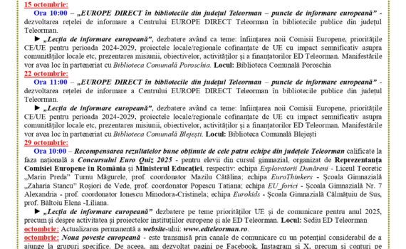 EUROPE DIRECT Teleorman este invitat mâine, 2 octombrie 2025, începând cu ora 11:00, la evenimentul organizat de Biblioteca Județeană „Marin Preda” Teleorman, cu ocazia Zilei Internaționale a Nonviolenței. Ziua Internațională a Nonviolenței, stabilită de ONU prin Rezoluția 61/271 (15 iunie 2007), ne amintește importanța nonviolenței ca metodă de soluționare a […]