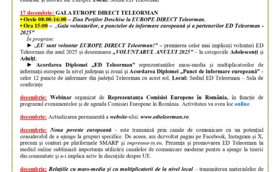 8 decembrie: • Ora 10:00 – „Europa pe înțelesul tuturor: descoperim autorii europeni”– De Ziua Autorilor Europeni, elevii de la Școala Gimnazială Vedea vor vizita Centrul de informare europeană EUROPE DIRECT Teleorman și vor descoperi autori și opere literare din diverse țări europene, precum și contexte culturale și istorice ale […]