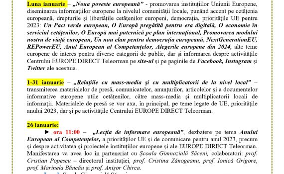 Luna ianuarie – Actualizarea permanentă a website-ului: www.edteleorman.ro. Luna ianuarie – „Noua poveste europeană” – promovarea instituţiilor Uniunii Europene, diseminarea informaţiilor europene la nivelul comunităţii locale, punând accent pe cetățenia europeană, drepturile şi libertăţile cetăţenilor europeni, democrația, priorităţile UE pentru 2023: Un Pact verde european, O Europă pregătită pentru era […]