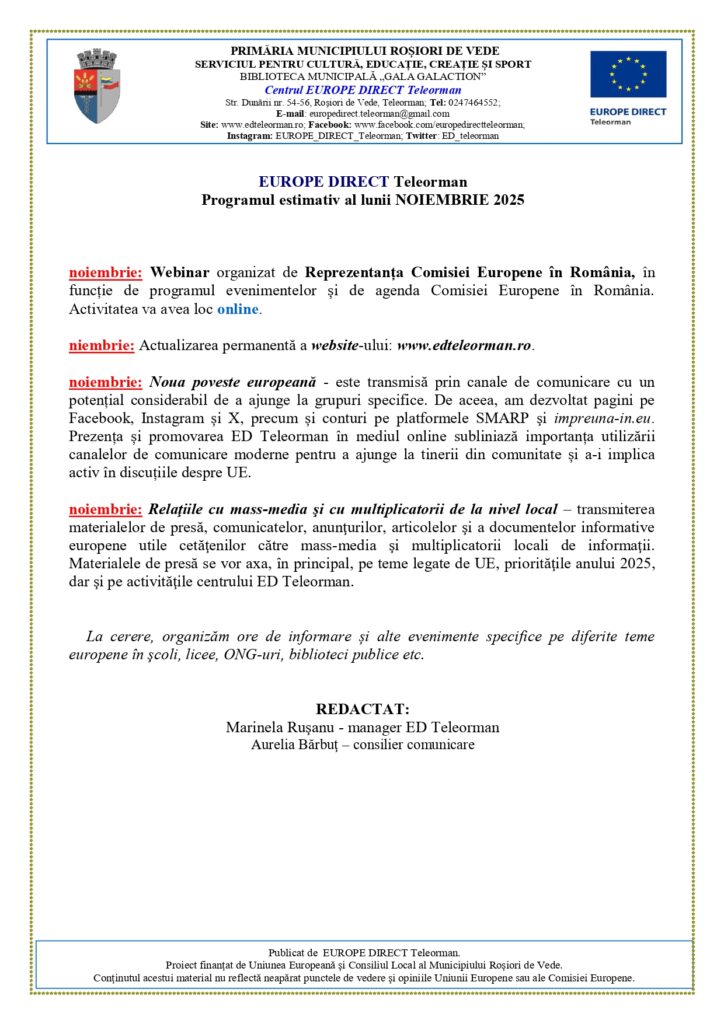 noiembrie: Relaţiile cu mass-media şi cu multiplicatorii de la nivel local – transmiterea materialelor de presă, comunicatelor, anunţurilor, articolelor şi a documentelor informative europene utile cetăţenilor către mass-media şi multiplicatorii locali de informaţii. Materialele de presă se vor axa, în principal, pe teme legate de UE, priorităţile anului 2025, dar şi pe activităţile centrului ED Teleorman.
