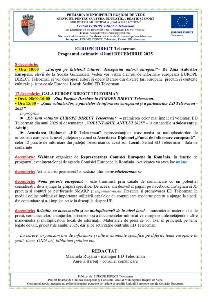 decembrie: Relaţiile cu mass-media şi cu multiplicatorii de la nivel local – transmiterea materialelor de presă, comunicatelor, anunţurilor, articolelor şi a documentelor informative europene utile cetăţenilor către mass-media şi multiplicatorii locali de informaţii. Materialele de presă se vor axa, în principal, pe teme legate de UE, priorităţile anului 2025, dar şi pe activităţile centrului ED Teleorman.