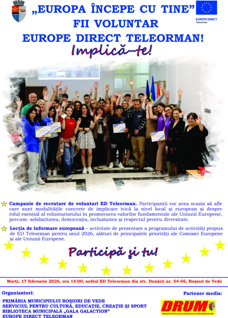Ai energie, inițiativă și dorința de a te implica? Vrei să faci parte dintr-o echipă care promovează valorile europene chiar în comunitatea ta? Atunci răspunsul e simplu: vino voluntar la centrul de informare europeană EUROPE DIRECT Teleorman!