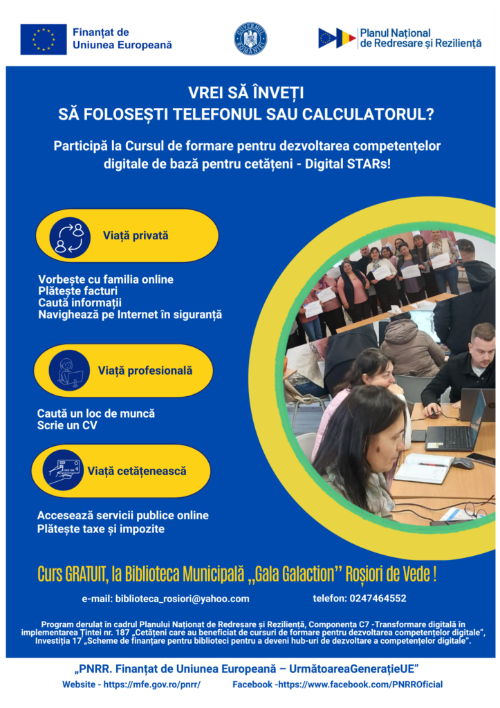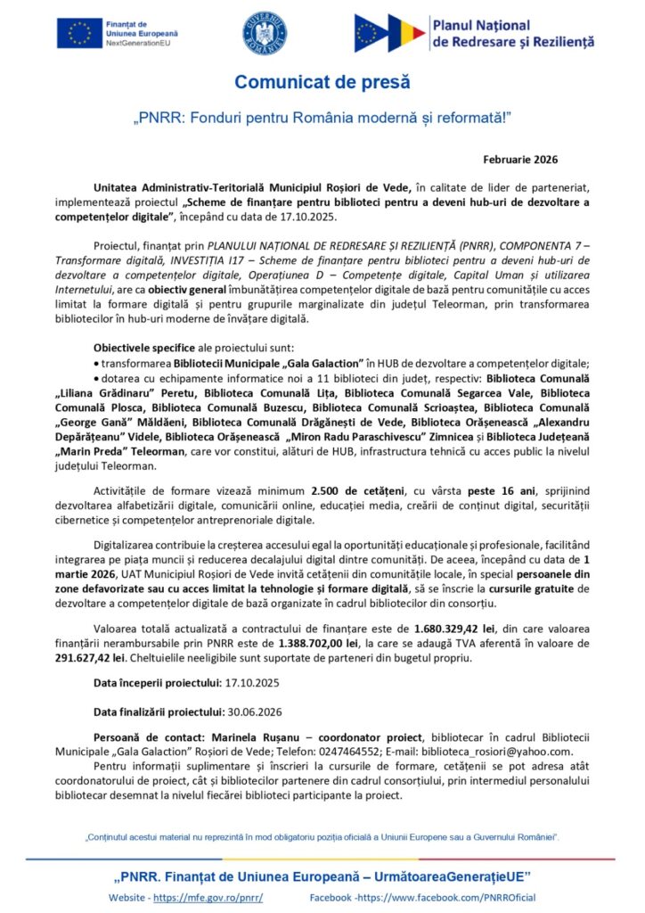 Cetățenii interesați se pot înscrie la programele de formare organizate la Biblioteca Municipală „Gala Galaction” Roșiori de Vede și în bibliotecile din consorțiul proiectului, beneficiind de acces gratuit la instruire digitală și servicii educaționale moderne.