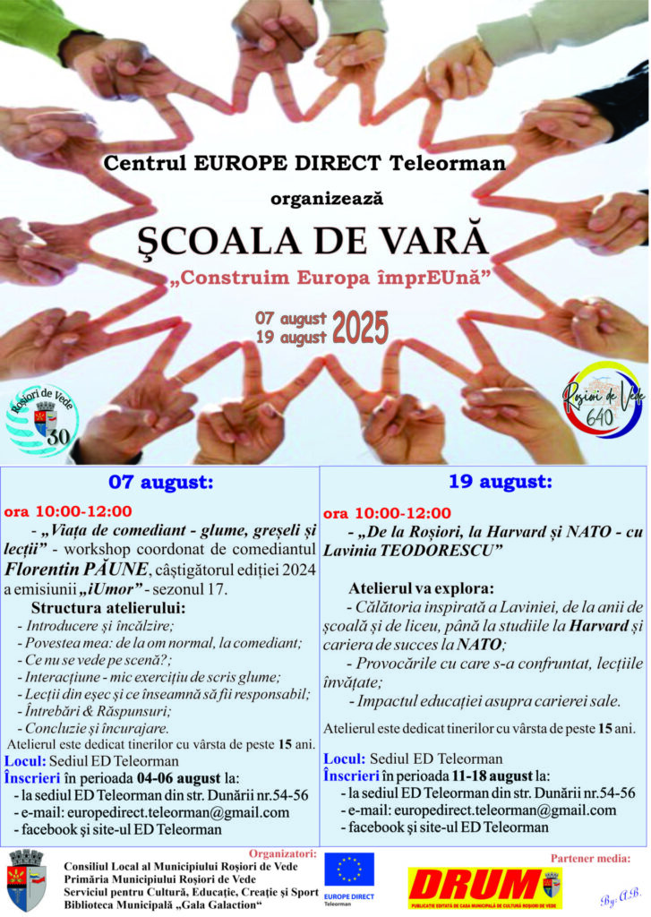 EUROPE DIRECT Teleorman, Centrul de Informare al Comisiei Europene în România, organizează în luna august o nouă ediție a Școlii de Vară, dedicată tinerilor cu vârsta de peste 15 ani.